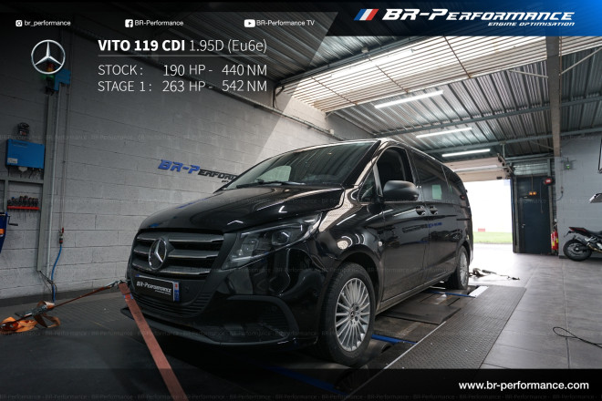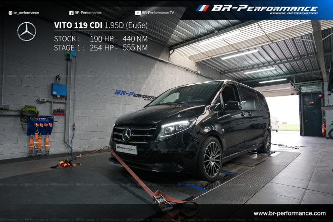 Optimisation du stage 1 sur mon Vito 2024, 119 avec transmission intégrale, passé de 190 chevaux à 267 chevaux, un véhicule qui marchait déjà bien, maintenant il marche très bien, très bon rapport de puissance et de qualité d'accélération malgré le poids du véhicule, troisième expérience avec BR performance de Lyon, une équipe au top, merci